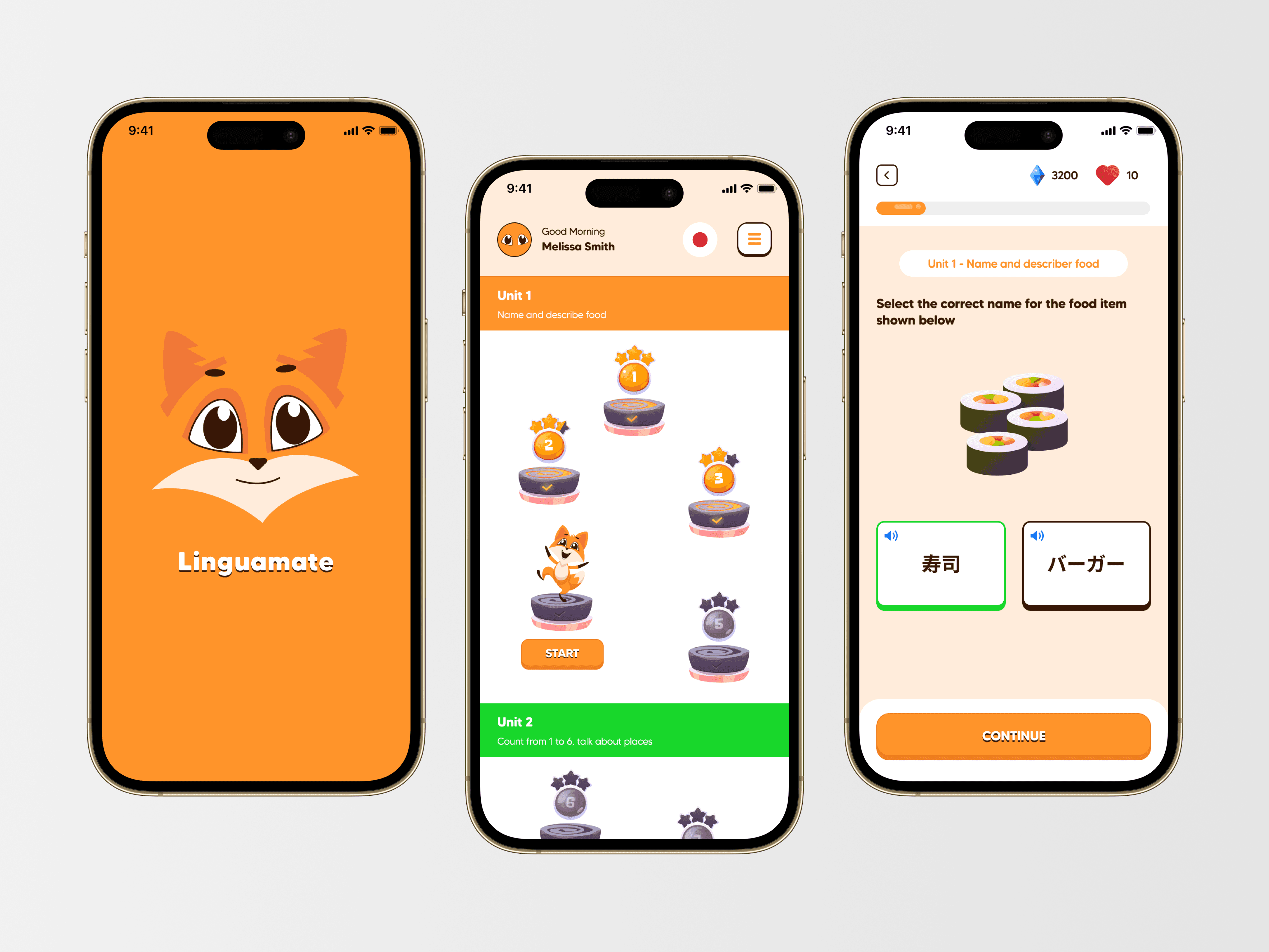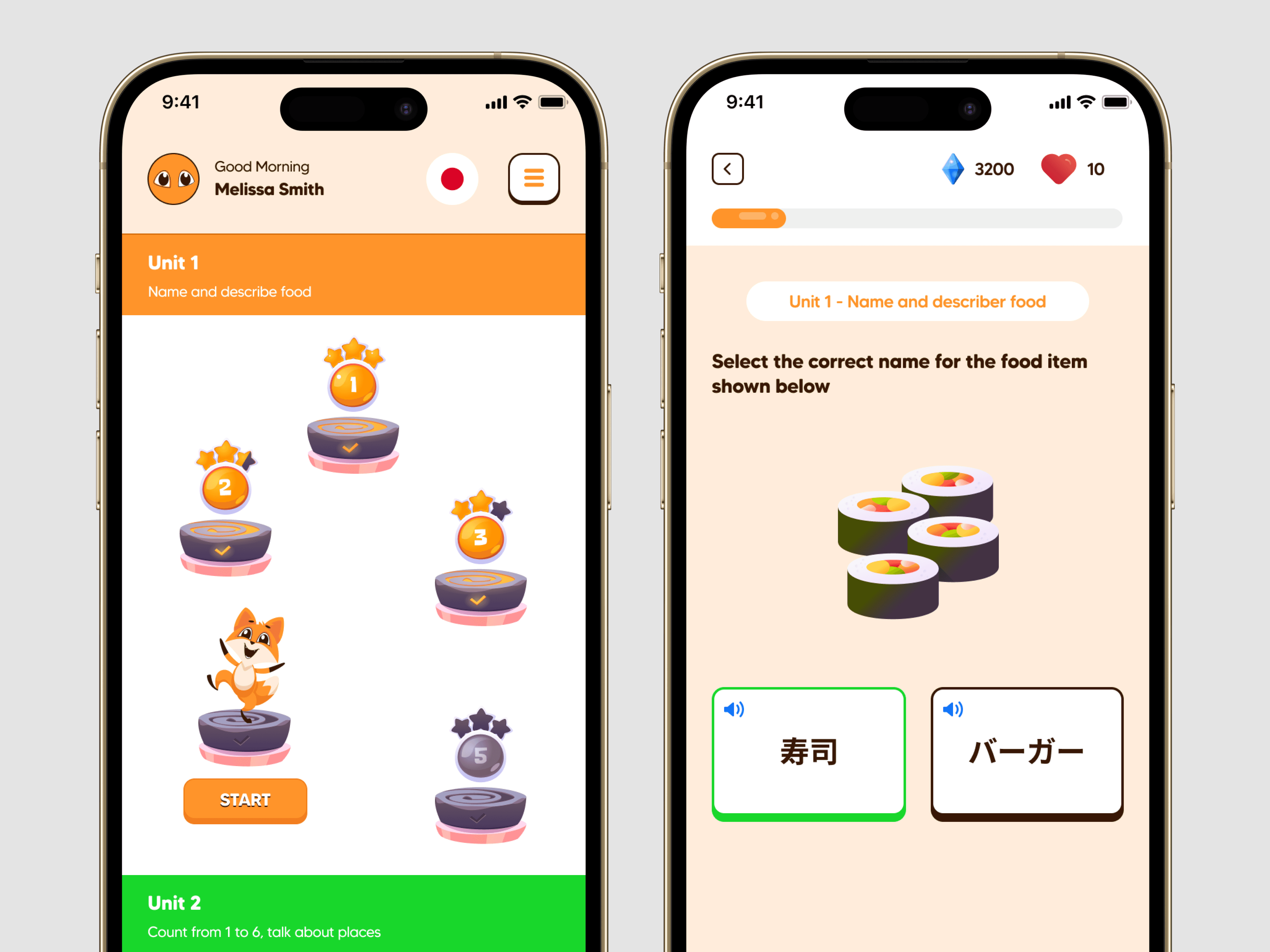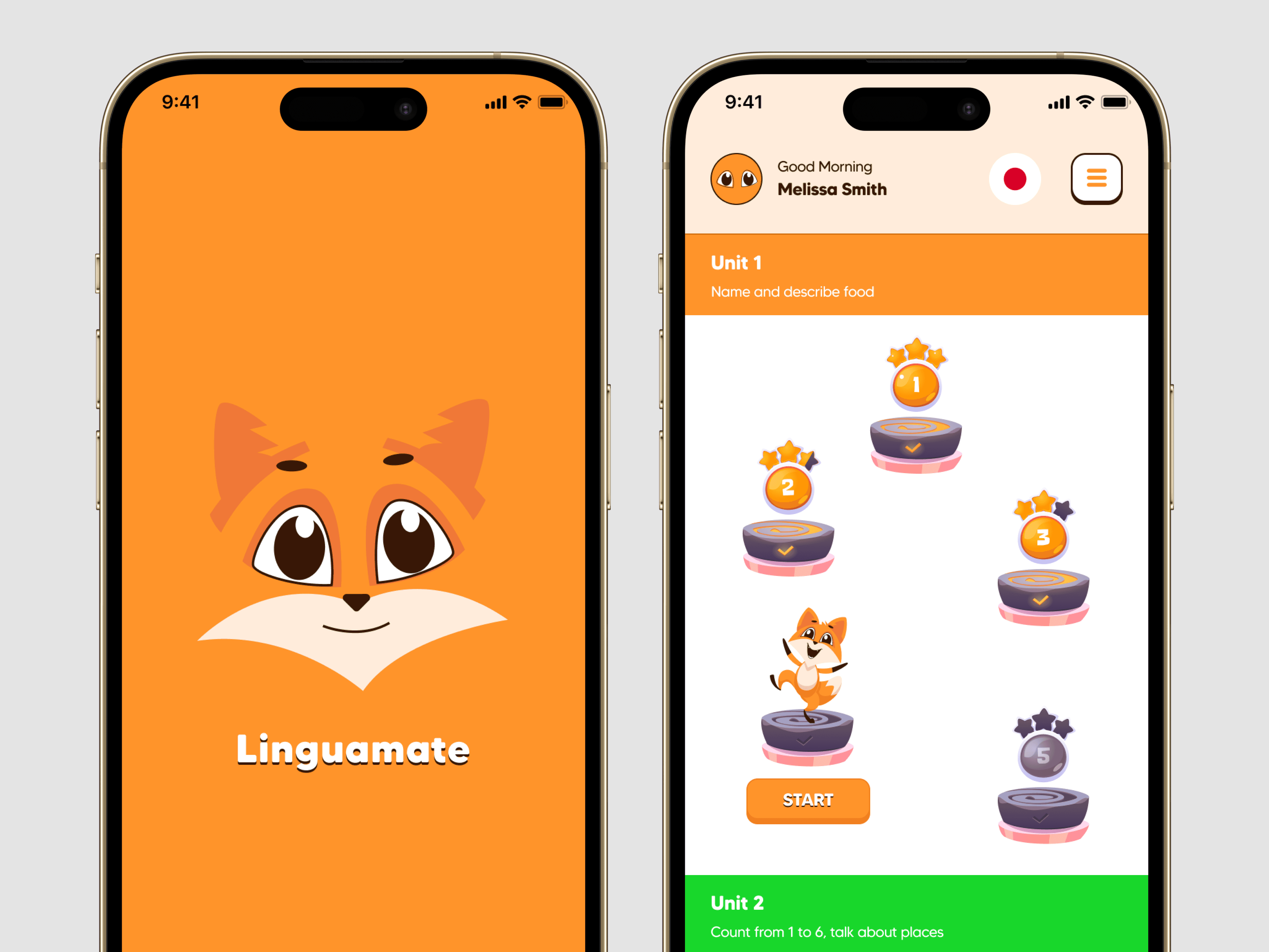 We crafted an identity and UI that embody approachability, fun, and progress: Brand Mascot: The fox was chosen for its universal charm and representation of adaptability and cleverness — perfect traits for a language-learning companion. Color Palette: Bright, cheerful colors like orange and green were used to create an inviting atmosphere while ensuring good contrast and readability. Typography: Clean, rounded fonts were used to maintain a friendly and accessible tone. Gamified UI: Progression paths shown as levels with rewards and stars. Interactive exercises with visual prompts and audio buttons. Encouraging micro-interactions to reward consistent practice. User Experience: Minimalist, intuitive navigation allowing users to focus on learning. Clearly segmented units and lessons. Responsive design adaptable for children and adults alike. The outcome is an app that feels like a game but teaches like a tutor.